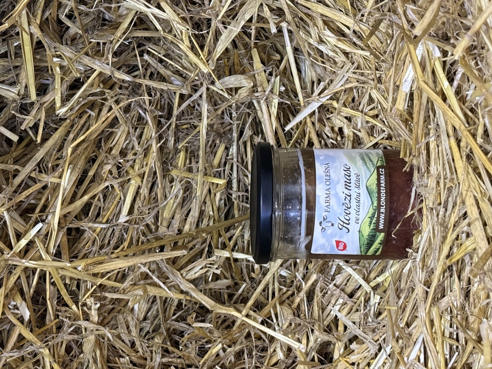 Naše BIO vyzrálé hovězí maso zavařeno ve sklenici. Znovu v nabídce únor 2026. Možno objednat předem.